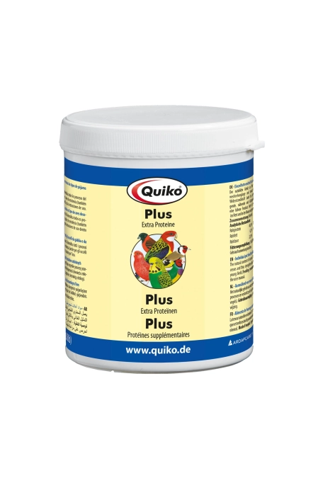 Toz halinde tüm genç kuşlar için iyi bir besin takviyesidir. Üstün besin nitelikleri ile iyi iştah arttırmayı teşvik etmektedir. Yüksek protein, vitamin ve optimum sonuçlar için özel olarak formüle edilmiştir. Metabolizmayı ve genç kuşların bağışıklık sistemini güçlendirir. Yuva terk etmeye hazır genç kuşlar ve aynı zamanda ilk tüy dökme zamanı için idealdir. Daha iyi üreme sonuçları elde etmek için kullanılması tavsiye edilmektedir. Yavru kuşlar, çok az besin alsa bile yeterli büyümenin en kritik dönemlerinde Quiko plus ile en önemli besinleri ile alır. Quiko Plus kuşlarda (genç kuşlar da dahil) vücüt işleyişini düzenleme, büyüme ve doku oluşum sürecini hızlandırır. Quiko Plus ayrıca vitamin B1, B2, B6, B12,Biotin ve doğal halde 29 ayrı aminoasit ve mineraller içerir