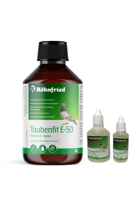 Üreme için hazırlık Kas Geliştirme Hücre Koruması Üremenin Tetiklenmesi Diğer yemlerle birlikte, Taubenfit E50 üreyen güvercinlere gereken miktarda e vitamini sağlamak içindir. Özellikle selenyum ile birlikte vitamin e'nin doğurganlık,yumurtadan çıkma,gelişim,kas yapısı ve uçuş performansı üzerinde olumlu etkileri vardır. Buna ek olarak selenyumun bağışıklık sistemine pozitif etkileri vardır. Vitamin e bilinen bir antioksidandır. Doymamış yağ asitlerini vitamin a ve hücleri serbest radikallerin zararlı etkilerinden korur.