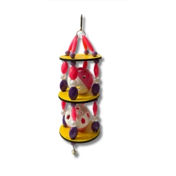 Muhabbet kuşlarının dikkatini çeken, iki katlı ahşap platformu ve renkli boncuklarıyla oldukça eğlenceli bir kuş oyuncağı! İçindeki zilli toplar sallandıkça ses çıkarır, kuşların oyun, merak ve hareket ihtiyacını karşılar. Sağlam kancası sayesinde kafese kolayca takılır.