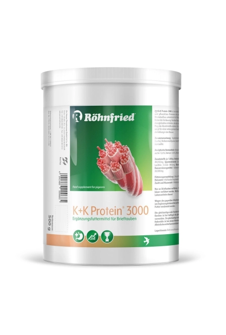 K+K Protein 3000 ayrıca bağışıklık sistemini destekleyen ve böylece Kuşların vücudun savunmasını güçlendiren değerli immünoglobulinler içerir. Eklenen sınırlayıcı amino asit metionin, tüy dökümü sırasında pürüzsüz protein metabolizması ve mükemmel tüy gelişimi sağlar.
