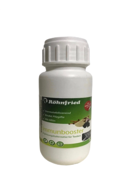 Bağışıklık güçlendirici, bağışıklık sisteminin dikkatini ve reaksiyon hızını ve dolayısıyla güvercinlerin canlılığını içten destekler. İlk defa, bağışıklık güçlendiricide güvercinlerin kolayca erişebildiği bakır ve çinko gibi fonksiyonel iz elementleri kullanıyoruz ve bu yeniliğin tarifini onaylı bir mikotoksin (mantar zehiri) bağlayıcı (aflatoksin B1) ile tamamlıyoruz. . Genç hayvan tozunda olduğu gibi, bağışıklık güçlendirici de güvercinleri stresli aşamalarda desteklemek için prebiyotik bileşenler, alliin, allisin öncüsü ve kolostrum içerir.