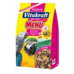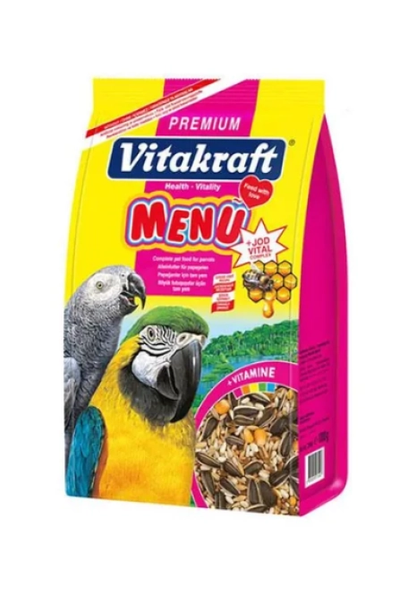 Vitakraft Menu Jod Vital Complex, Papağan türü kuşlar için son derece zengin ve türe özgü içeriğe sahip, sağlıklı beslenme standartlarına uygun yüksek kaliteli karışık içeriğe sahip temel yemdir.